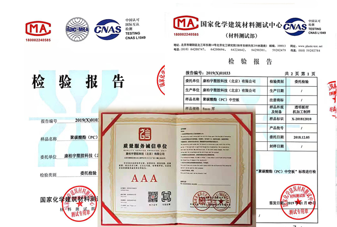 康柏宇生產(chǎn)所用原料為純PC(聚碳酸酯),通過(guò)熔融擠壓設(shè)備,模具定型,應(yīng)力去除、覆膜包裝等層層生產(chǎn)工藝,只為一塊好板材。所出產(chǎn)品均配備國(guó)家化學(xué)建筑材料測(cè)試中心出具的檢測(cè)報(bào)告