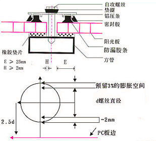 a、螺絲或鉚釘穿孔安裝時,板材的開孔孔徑須比螺栓或鉚釘直徑大50%,以備熱脹冷縮時板材產(chǎn)生位移。禁止任何直接開孔同時固定螺絲或者鉚釘?shù)淖龇?,無法預(yù)留熱脹冷縮空間。
