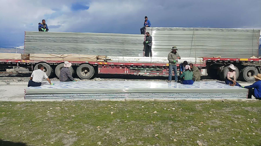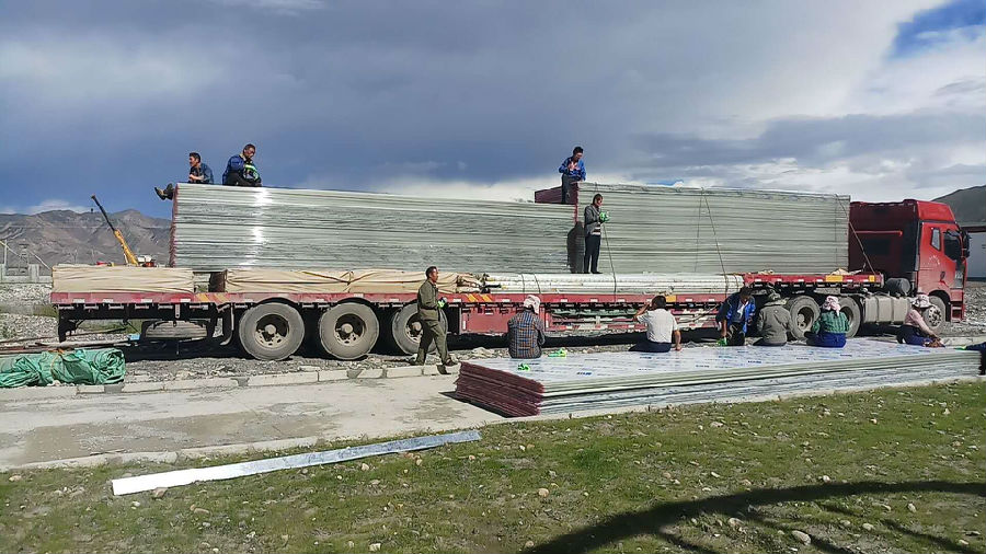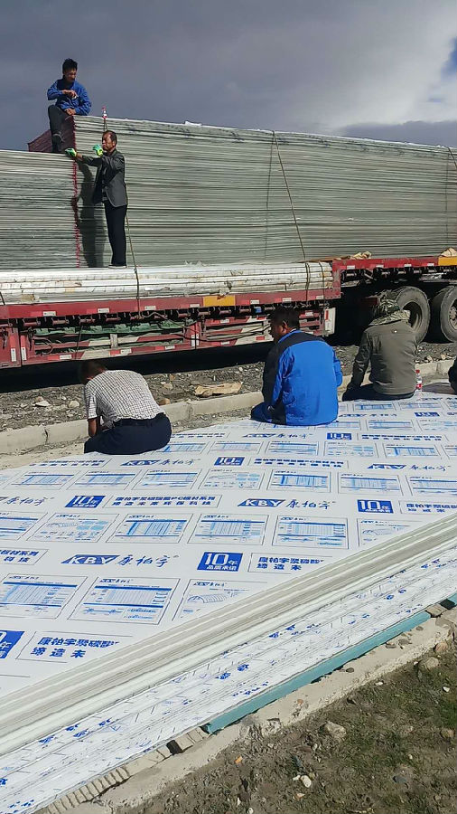 西藏農(nóng)業(yè)大棚項(xiàng)目,第一批一萬(wàn)五千平米的康柏宇防霧滴陽(yáng)光板到達(dá)工地現(xiàn)場(chǎng)。